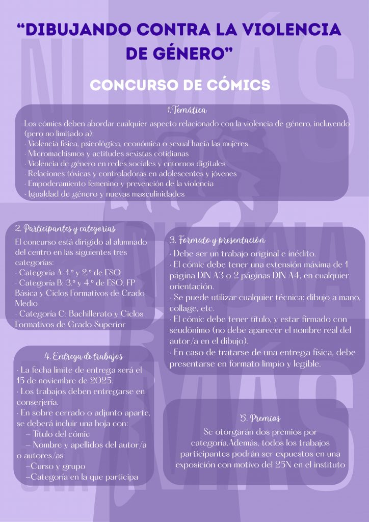 Con motivo del 25 de noviembre, Día Internacional para la Eliminación de la Violencia contra la Mujer, el IES Emilio Canalejo Olmeda convoca el Concurso de Cómic “Dibujando contra la violencia de género”, una iniciativa para sensibilizar y promover la igualdad a través de la creatividad del alumnado.