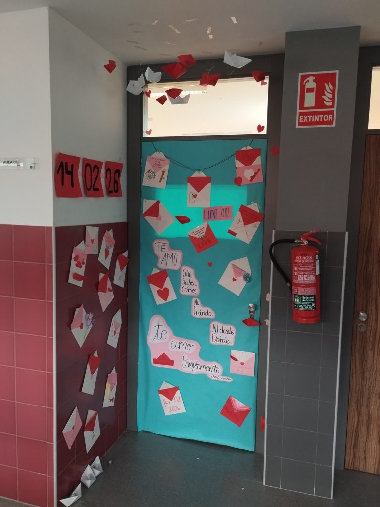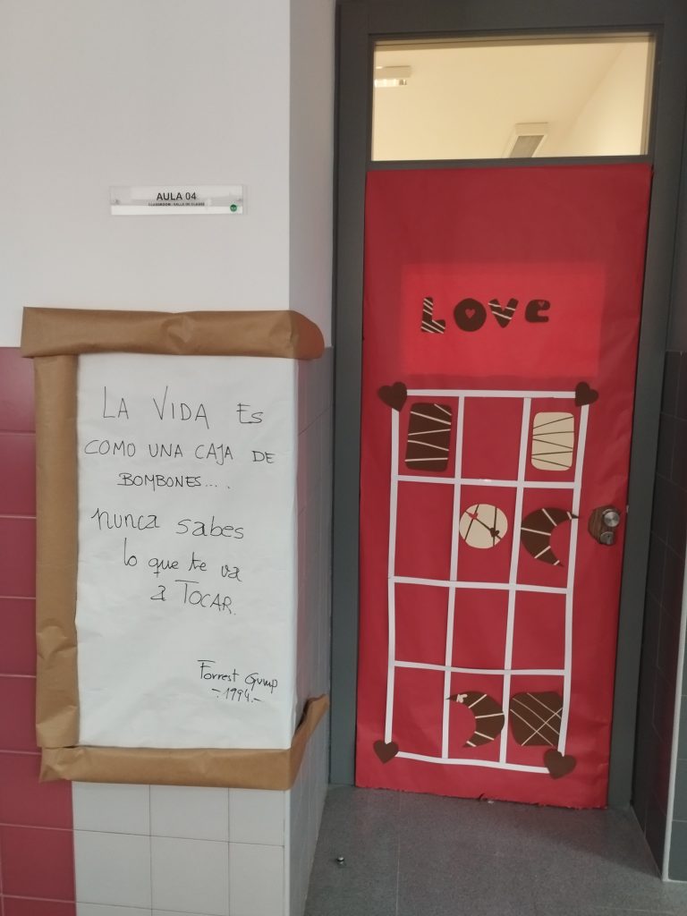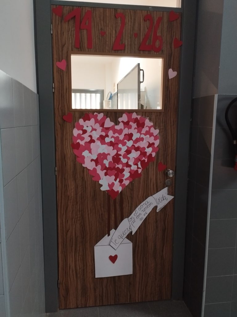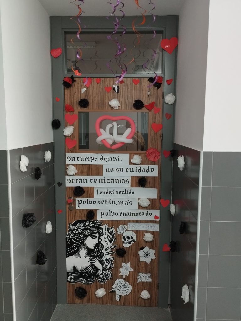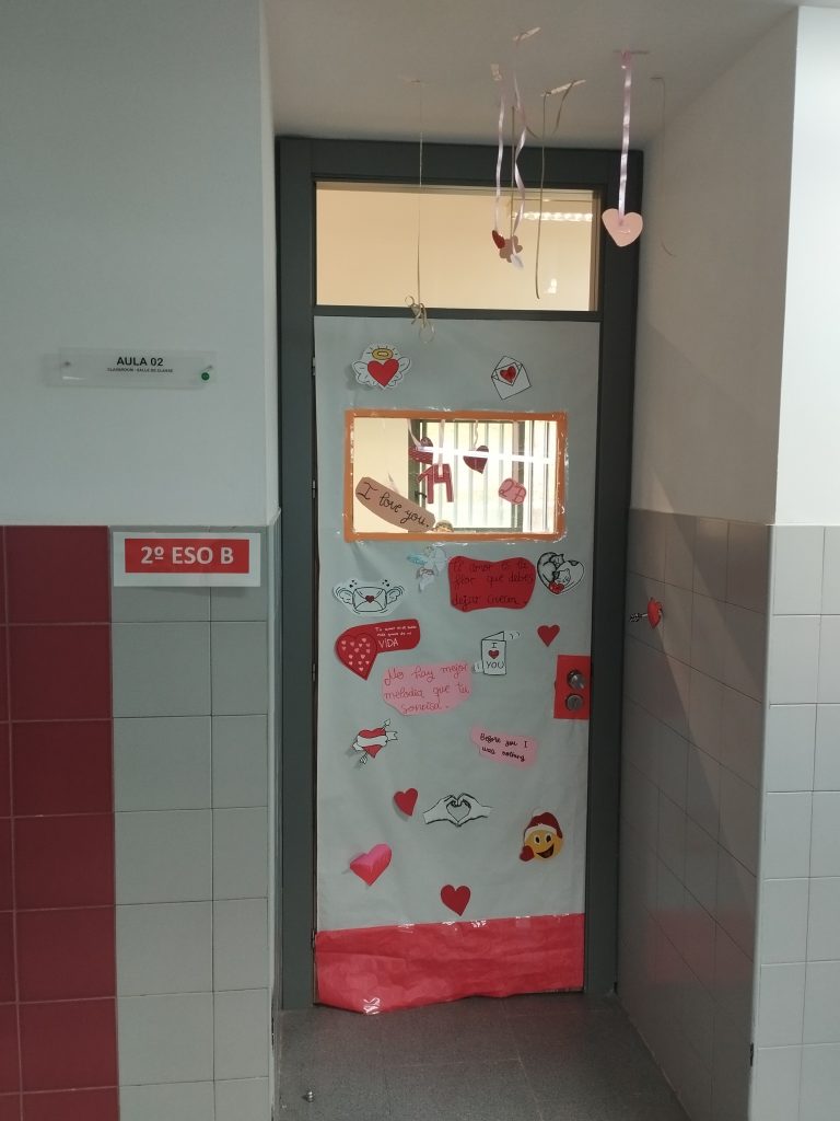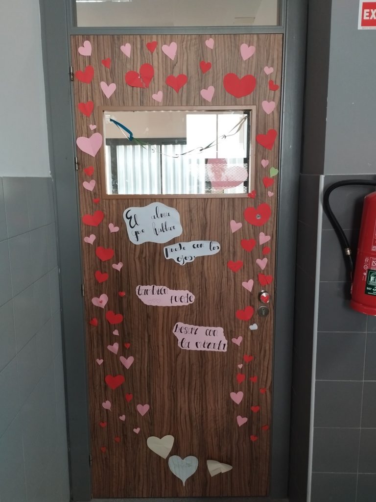 Entre las actividades que se han llevado a cabo por San Valentín desde la biblioteca del centro, este año hemos incorporado un concurso de puertas, propuesto por nuestra compañera Lola García, en el que podían participar todas las tutorías de la ESO. La condición era seleccionar una frase literaria, musical o cinematográfica y, en torno a dicha frase, decorar la puerta con motivos amorosos. Todos los grupos se han implicado muchísimo y la propuesta ha sido acogida con mucho entusiasmo. ¡El curso que viene repetiremos!