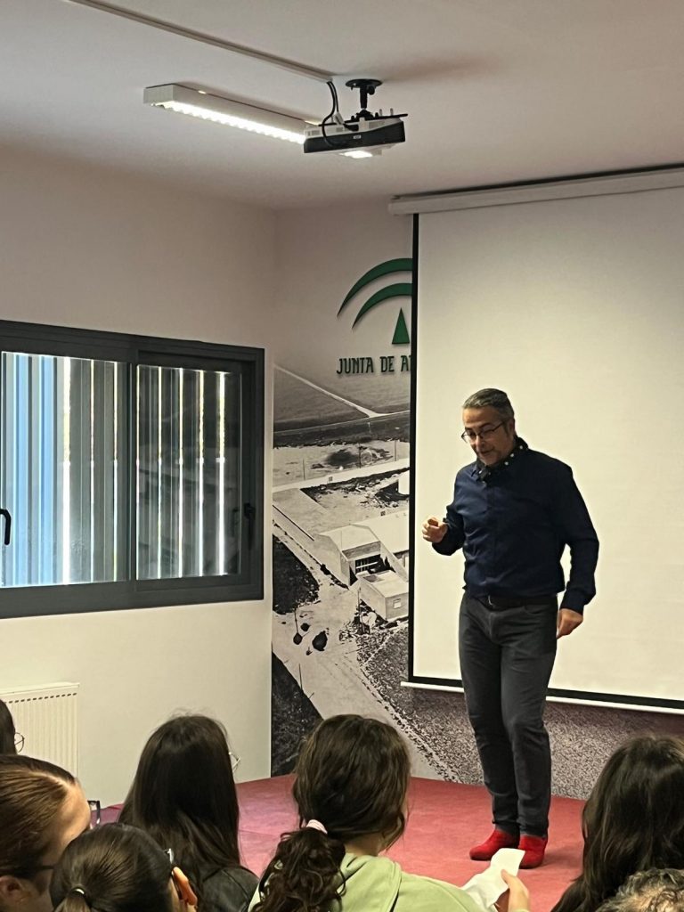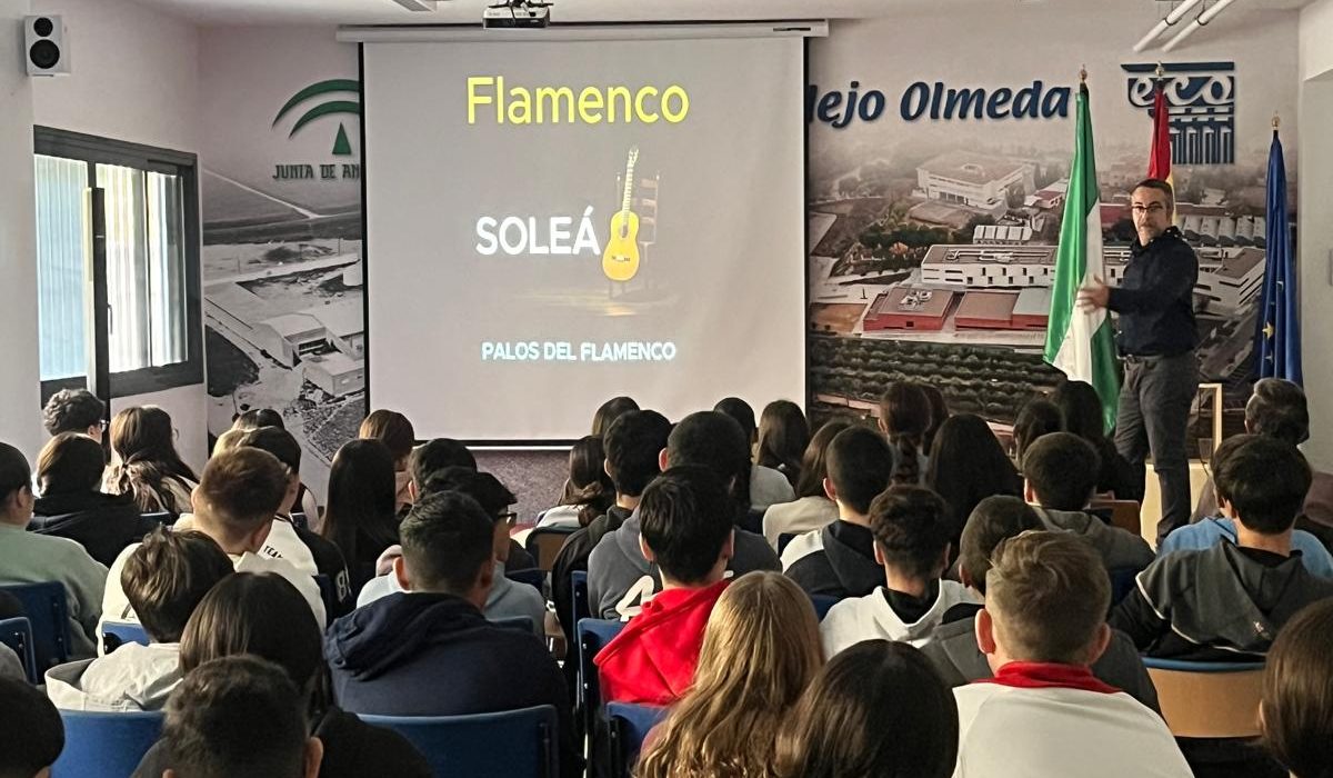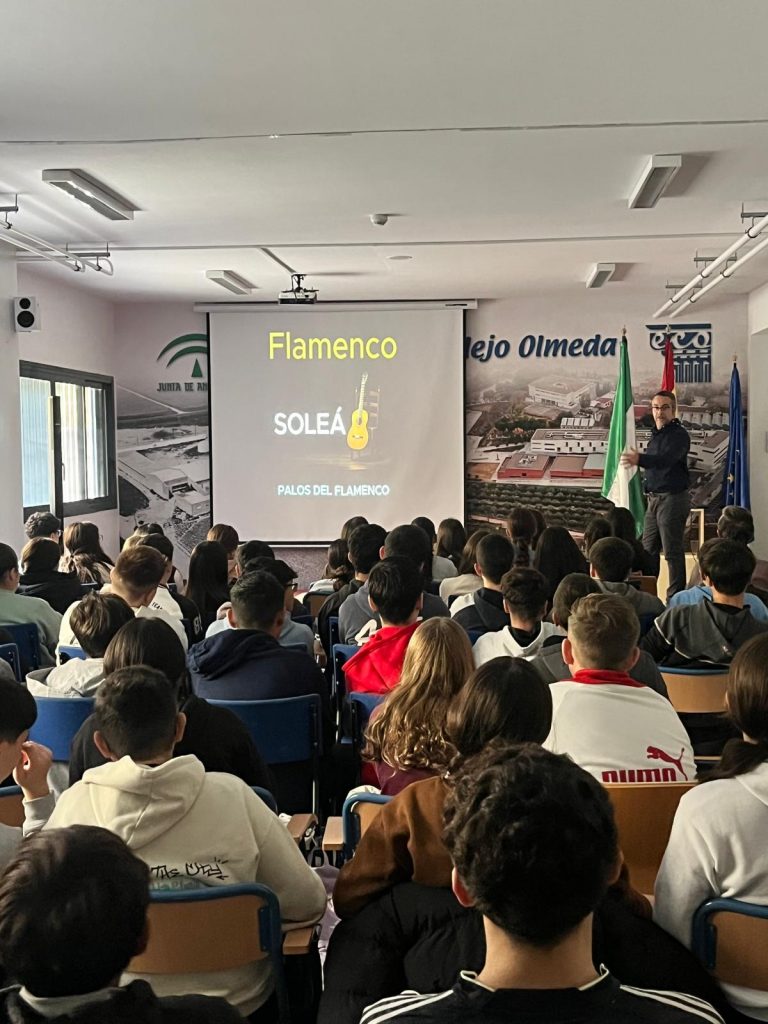 Para la actividad que organizamos el viernes 21 de noviembre, contamos con la presencia de Patricio Gómez, artista que desarrolla su talento flamenco en nuestra localidad de Montilla. Con nuestro alumnado de 3º ESO como espectador, Patricio realizó un recorrido por la historia del flamenco, por sus palos más destacados, así como por sus artistas principales. Fue una charla muy interesante en la que no sólo hubo lugar para la teoría, sino también para la práctica, pues, por ejemplo, los ritmos que explicó, los acompañó de bailes. Además, nos dejó a todos con la boca abierta con un espectáculo final de baile mientras sonaba una de las canciones más famosas de El Barrio.