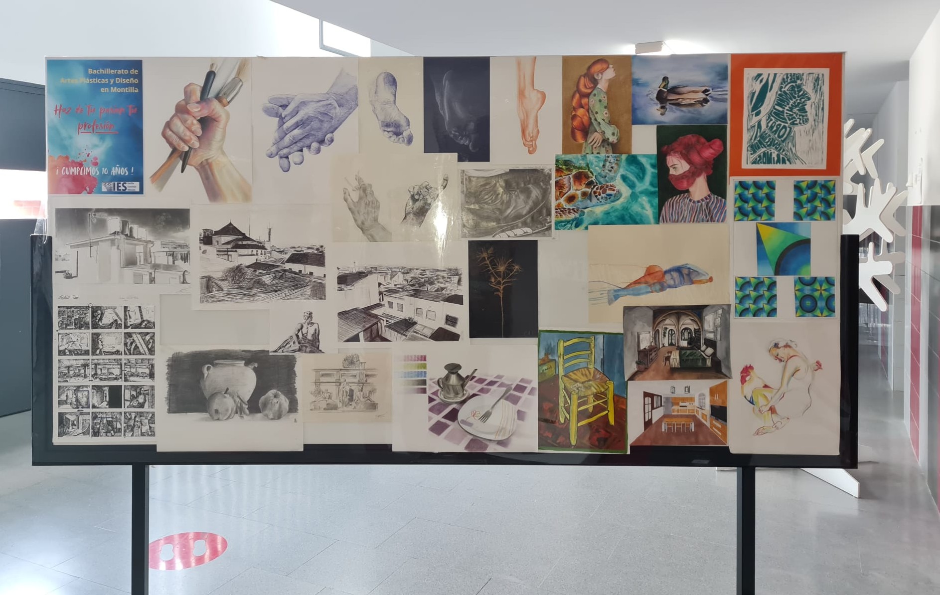 Uno de los momentos más destacados fue la participación del alumnado del Bachillerato de Artes, que montó un panel expositivo con una selección de trabajos realizados en clase. Esta muestra sirvió no solo para exhibir el talento artístico del alumnado, sino también para celebrar un aniversario muy especial: diez años desde la implantación de la especialidad de Artes en nuestro centro.