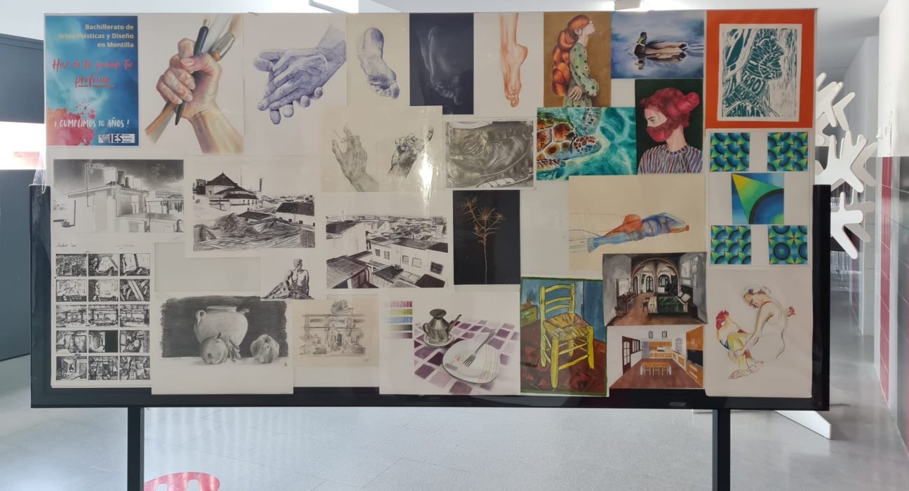 Uno de los momentos más destacados fue la participación del alumnado del Bachillerato de Artes, que montó un panel expositivo con una selección de trabajos realizados en clase. Esta muestra sirvió no solo para exhibir el talento artístico del alumnado, sino también para celebrar un aniversario muy especial: diez años desde la implantación de la especialidad de Artes en nuestro centro.