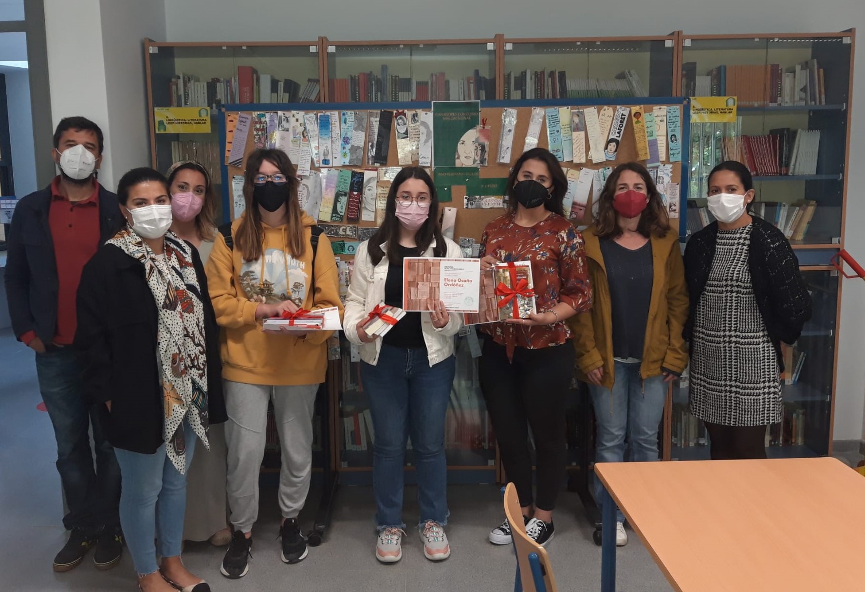 Ganadoras del concurso. De izquierda a derecha: Sonia Morales Martínez (2º ESO), Elena Ocaña Ordóñez (4º ESO) y Rosa Mª Palma González (1º BachGanadoras recogiendo el premio con los profesores del Departamento de Lengua