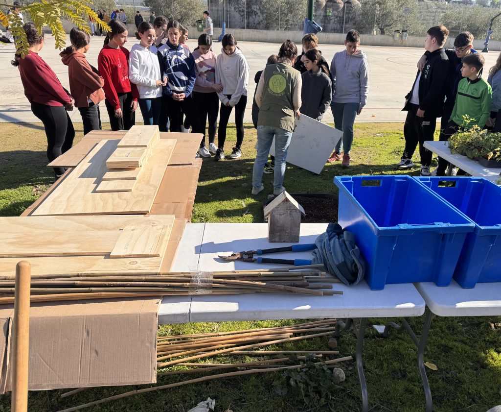 Durante la jornada, el alumnado ha desarrollado diversas actividades prácticas, entre ellas la plantación de un bancal de aromáticas, la preparación del material necesario para la construcción de un hotel de insectos y la colocación de varias cajas nido en el entorno del huerto.
